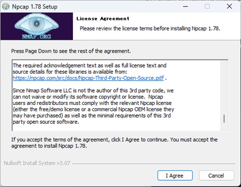 ⑩Npcapインストール前の ライセンス 確認 → ‘I agree’ クリック