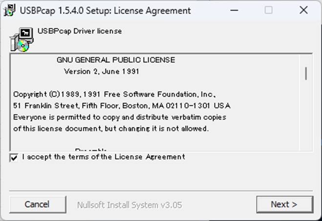 ⑬USBPcapインストール前の ライセンス 確認 → 同意チェック後、‘Next’ クリック