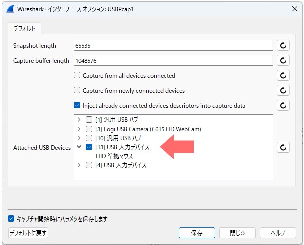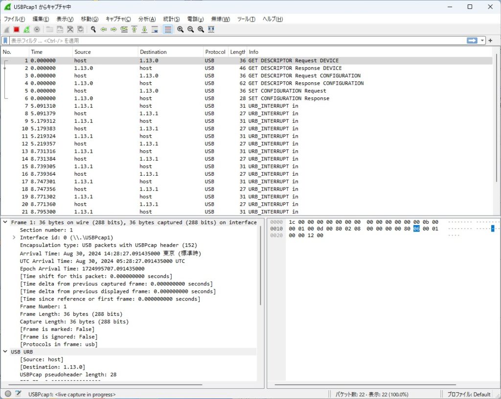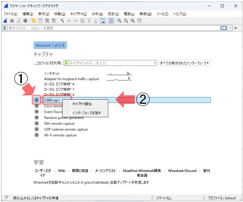 ①をクリックすると複数接続されているUSB機器の中から対象を選択できます。②位置での右クリックで表示されるコンテキストメニューの中から、‘キャプチャ開始’ をクリックするとキャプチャ開始します。やり方の問題と思いますが、キャプチャ開始しないこともあり、再起動したりしています。